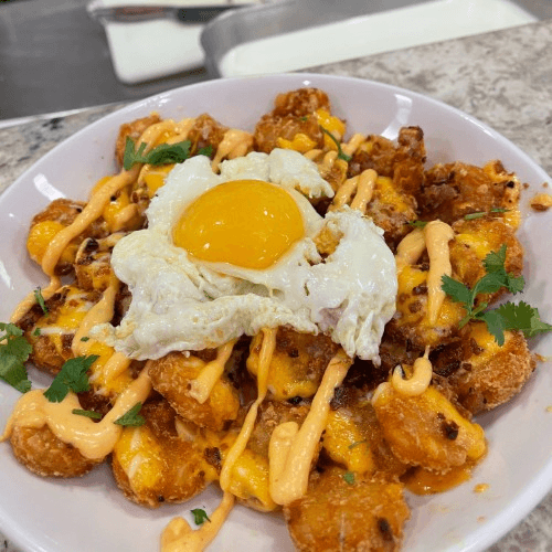 Crispy tots topped with cheddar cheese, diced sausage, sausage gravy, chives and two eggs any style.
