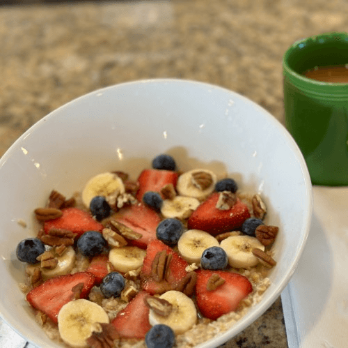 Oatmeal topped with blueberries, pecans, strawberries, bananas, brown sugar and milk. Served with an English muffin. Healthy choices