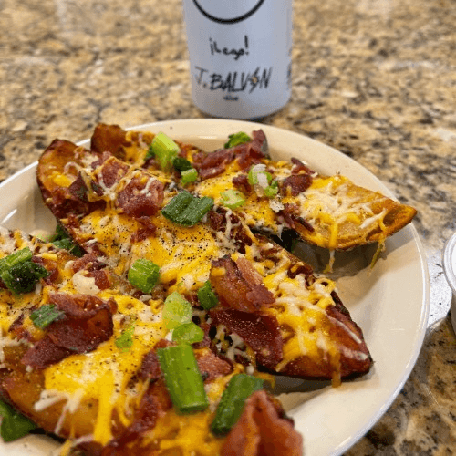Fresh baked potatoes cut in quarters fried and topped with bacon, chaddar cheese, chives and sour cream.